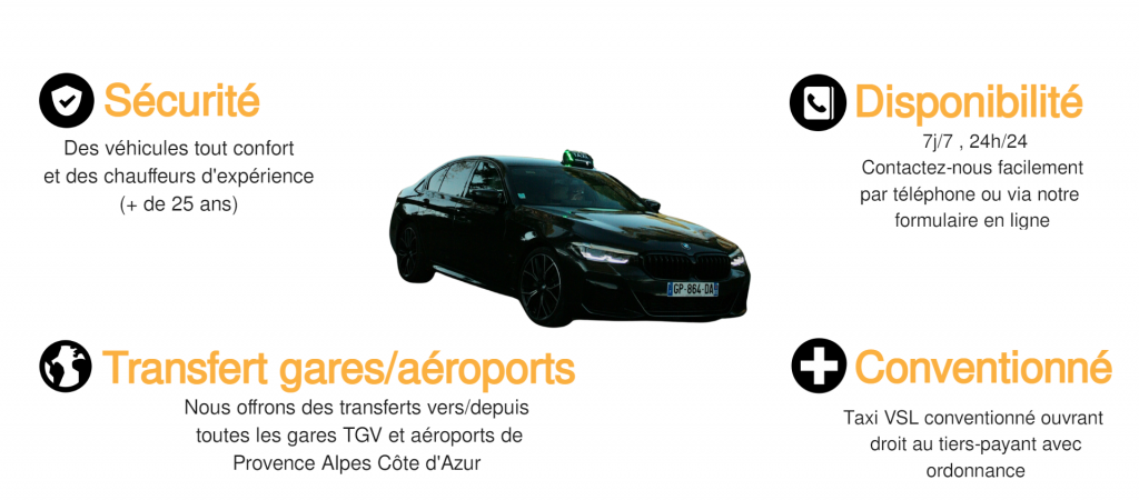 Taxi conventionné PACA pour vos trajets vers et depuis hôpital, clinique, centre de rééducation, maison de repos… Taxi VSL conventionné à Draguignan et ses environ: bénéficiez du tiers payant et une prise en charge transport VSL 100% par votre caisse et votre mutuelle (avec prescription médicale de transport) , taxi conventionné sans avance de frais. Avec la prescription de transport nécessaire, vous n’avez aucun frais à avancer.